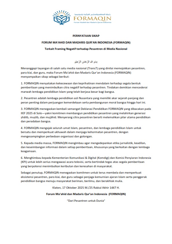 Menanggapi tayangan di salah satu media nasional (Trans7) yang dinilai memojokkan pesantren, para kiai, dan guru, maka Forum Ma‘ahid dan Madaris Qur’an Indonesia (FORMAQIN) menyampaikan sikap sebagai berikut: